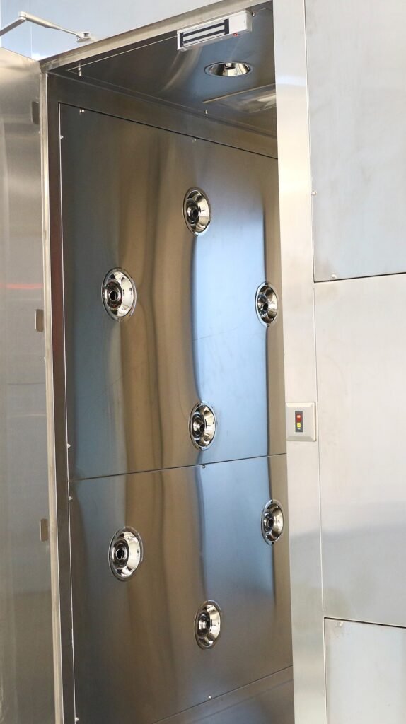 Designed for efficiency and hygiene, the mist shower features a stainless steel (AISI 304) removable walkable grid, drip tray with drainage system, and an under-basin for effective collection of discharged contaminants. The blower-driven recirculation system ensures continuous filtration, while the PPE disposal mechanism includes a dedicated deactivated PPE dump box with an external access hatch, allowing safe removal and disposal without compromising cleanroom integrity.